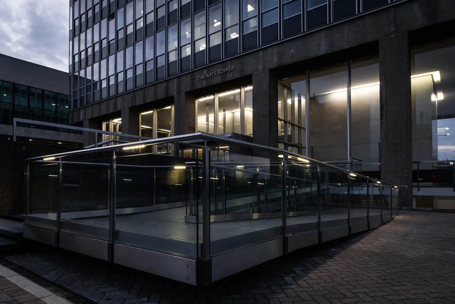 Brink is an entirely bespoke product line, so the Arts Tower’s railings were custom-designed and manufactured specifically for this project. The brushed stainless-steel rails used feature elegant squared and linear profiles and end pieces, guiding users up or down the switchback ramp.