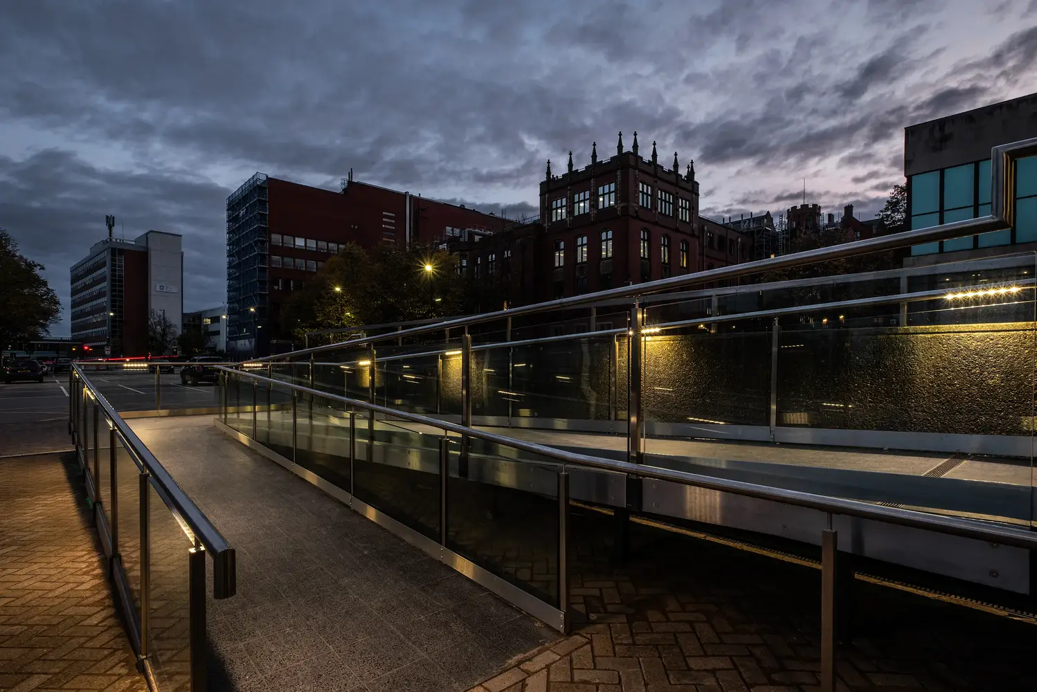 Evenly spaced small luminaire modules, built into the underside of the rails, are controlled by the Thorlux SmartScan system, with a sensor installed in front of the Porter’s Office. SmartScan controls ensure the luminaires only activate when ambient light levels are low and the ramp is in use. This maximises energy efficiency while providing safe passage for all users. The vandal and corrosion-resistant luminaires are rated to IP66 and IK10.