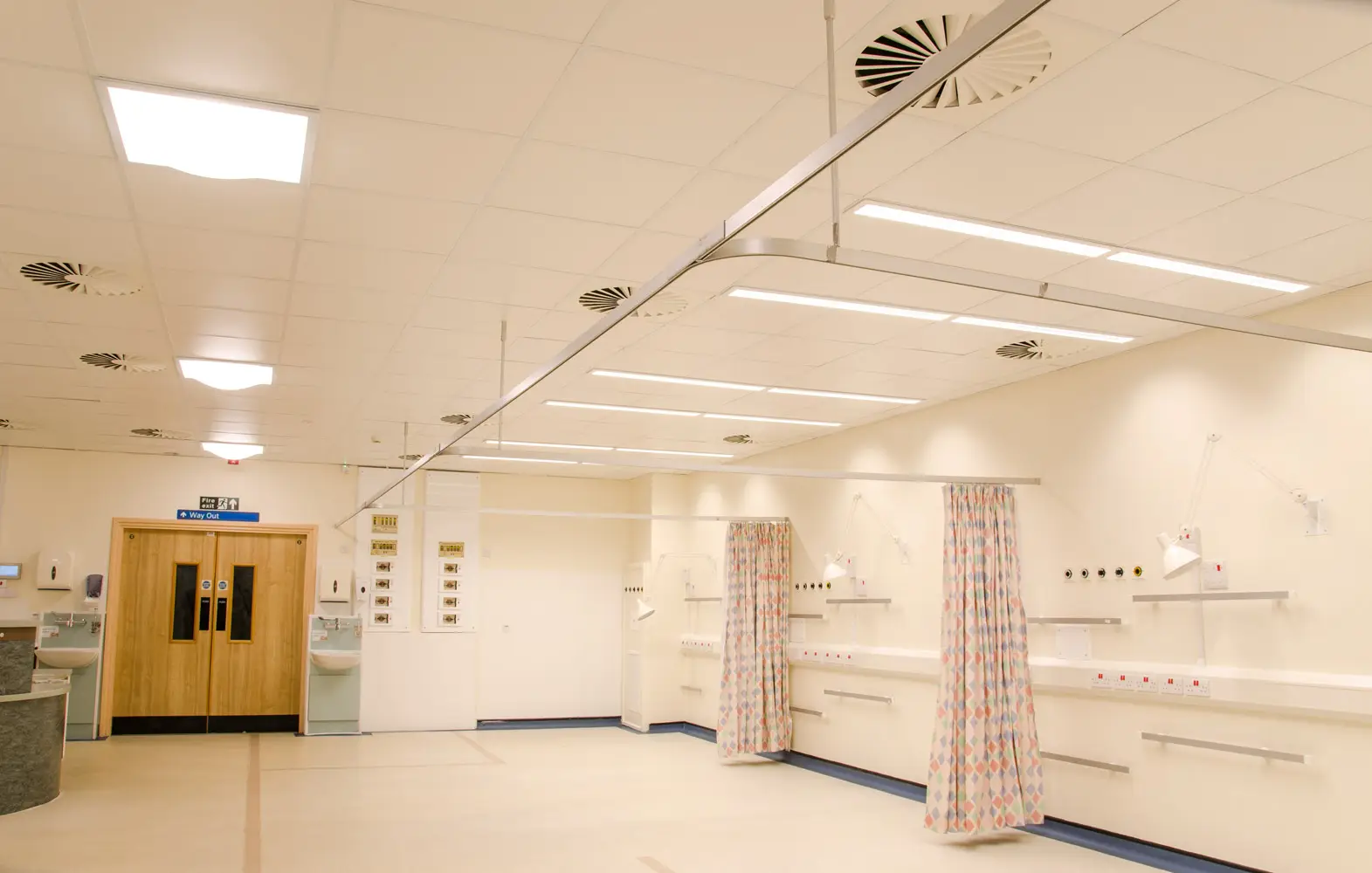 The lighting control system installed is from the Thorlux ColourActive range, which cycles the colour temperature of the light source over a 24 hour period. The colour temperature (CCT) of the luminaires varies from 3000K to 6500K to replicate natural daylight changes. In addition, the system is dimmable providing individual lighting level control within each bed bay, whilst maintaining outstandingly high uniformity and a shadow free working platform for staff. Crash scenes are included at each bedhead, and for the full ward, to give maximum output (1000 lux +) from one fail safe switch.
