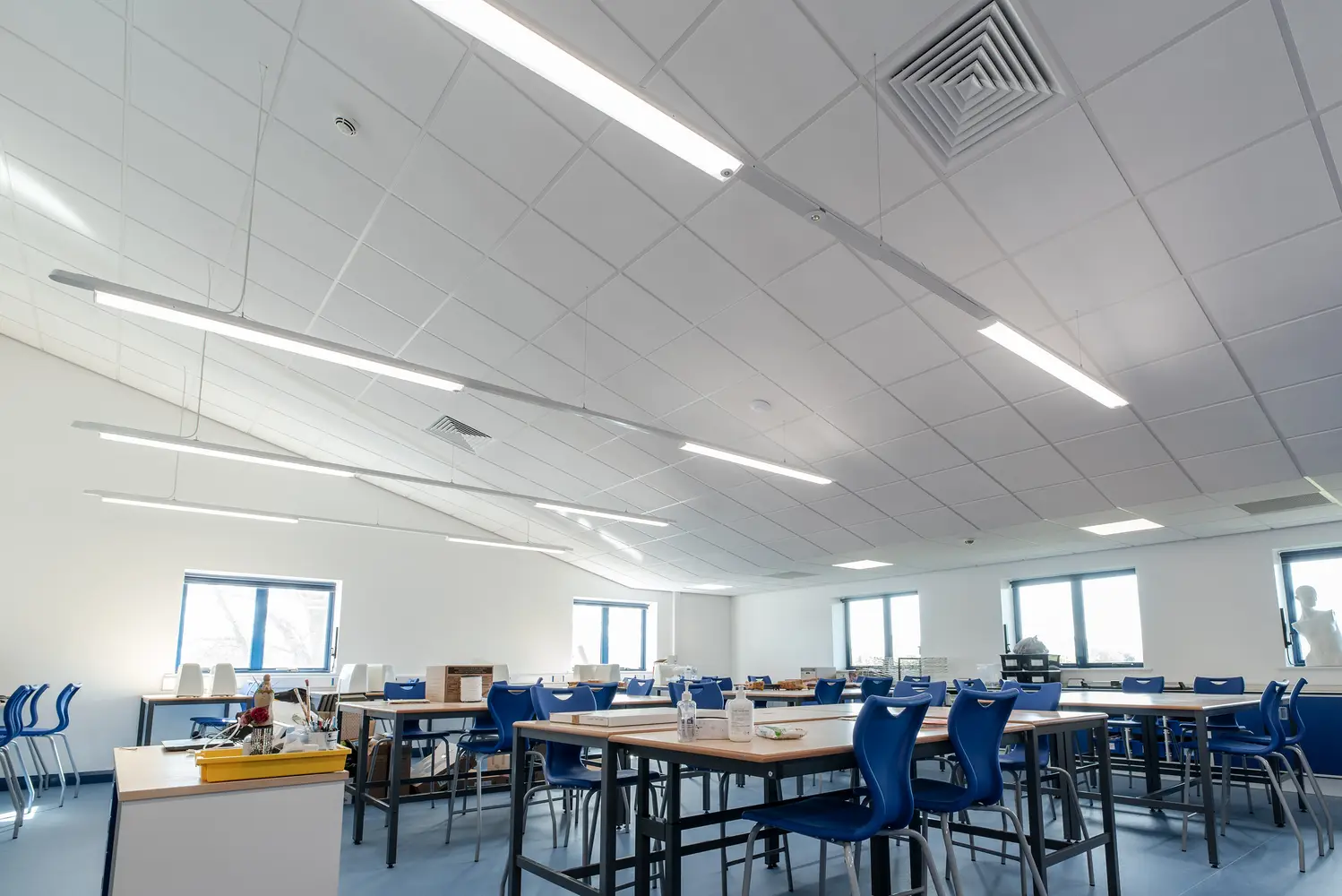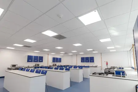 The Thorlux Flex System has been installed in a number of the new classrooms. The Flexline breaks from convention taking the lighting outside of the ceiling tile offering freedom and flexibility of scheme design. Combined with this, the dual light engine in the Flexview brings a touch of the outside inside with its illuminated picture window. Separate high-performance optics provide the main space illumination ensuring quality and efficiency.