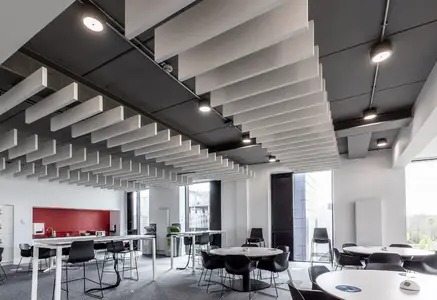 The Zipline has been installed in the open plan study areas. The Zipline combines architectural impact, longevity and supreme efficiency . Extruded aluminium trunking is connected to a range of luminaire modules. These modules can be a combination of luminaire, emergency luminaire, spotlight and passive infra-red detector and are designed to snap into sockets located at regular intervals, ensuring a fast, flexible installation. The Zipline is available with five power options, broad, narrow and double asymmetric light distributions and a variety of accessories.